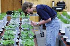 Wir haben u.a. Versuche mit verschiedenen Böden, Pflanzen und STOCKOSORB®- Produktvarianten bei unterschiedlichen Bewässerungsregimes durchgeführt. Links: Bonitur der Buschbohne während eines Gefäßversuchs.
